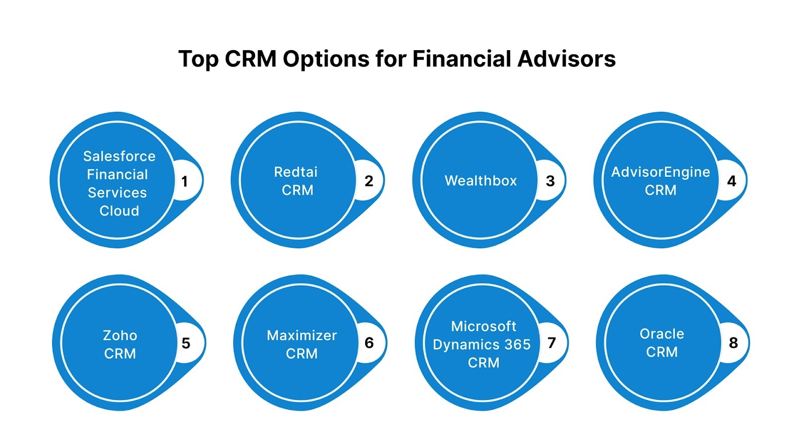 - Leading CRM options for financial advisors include Salesforce Financial Services Cloud, Redtail CRM, Wealthbox, AdvisorEngine CRM, Zoho CRM, Maximizer CRM, Microsoft Dynamics 365, and Oracle NetSuite.