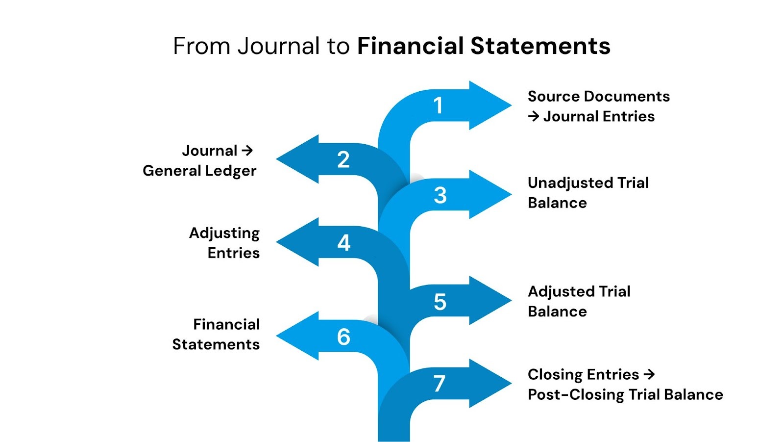 Entries post to the ledger, roll into an Unadjusted Trial Balance, then are updated with accruals, deferrals, and estimates to produce the Adjusted Trial Balance. From there, you prepare the Income Statement, the Statement of Owner’s Equity or Retained Earnings, the Balance Sheet, and the Cash Flow Statement, and finally close temporary accounts.